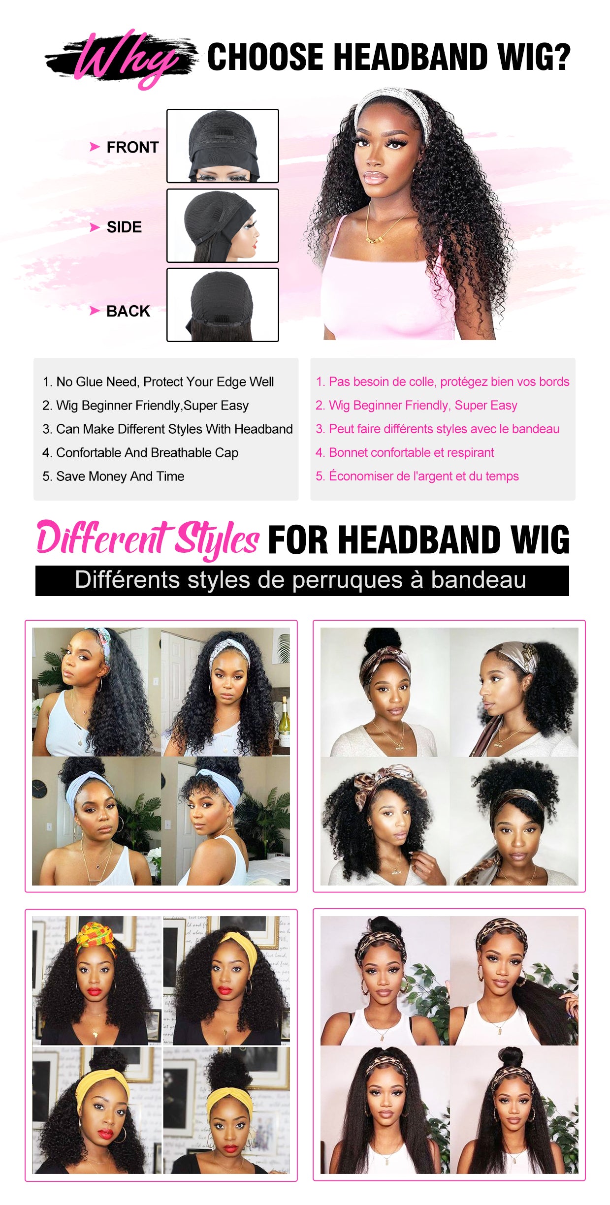 MORE FACE Headband Bob Wig Kinky Curly Human Hair Wig No Lace Glueless Wig